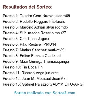 Lista de participantes: Taladro Cero Nueve taladro09, Criz Tiann Jagerx, Matias Sanchez mati-gti89, Marcelo Adrian alvaradomdp, Felipe Fuenza Clarkkent, Gabriel Palazzo GABYMILITO-ARG, Piku Restiver PIKU14, Tin Boca Tin, Rodolfo Roggero Fitofarais, Ricardo Vega juniorcr, Sublimados Rosario mou27, Juan M. Mouxaut JuanMxt, Maxi Quiroga Themaxiquiriga.