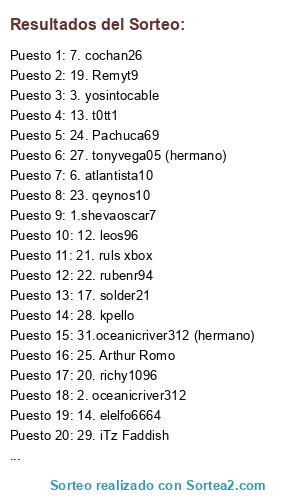 Lista de participantes: 1.shevaoscar7, 2. oceanicriver312, 3. yosintocable, 4. chock7, 5. Crizabi47, 6. atlantista10, 7. cochan26, 8. owenpad, 9. AdrianMCR28, 10. hullshulk, 11. LTP Terry 4, 12. leos96, 13. t0tt1, 14. elelfo6664, 15. RAUL2417, 16. jaraz99, 17. solder21, 18. hernandezxbox14, 19. Remyt9, 20. richy1096, 21. ruls xbox, 22. rubenr94, 23. qeynos10, 24. Pachuca69, 25. Arthur Romo, 26. tonyvega05, 27. tonyvega05 (hermano), 28. kpello, 29. iTz Faddish, 30.Saul ddx onerth, 31.oceanicriver312 (hermano), 32.david5489.