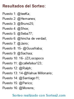 Lista de participantes: @Perico;, @Bruno25;, @Ralph;, @Santiago11;, @callefalsa123;, @Jairo;, @Morens;, @Hernanes;, @Sachaa;, @Shox;, @hincha de verdad;, @teeKa;, @Seba77;, 14-@Nahue Millonario;, 15- @Guusfraba;, 16- JZ/Locopoco.