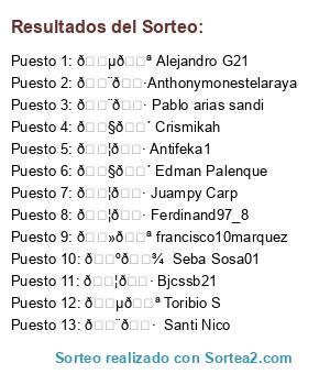 Lista de participantes: 🇦🇷 Juampy Carp, 🇧🇴 Crismikah, 🇺🇾 Seba Sosa01, 🇦🇷 Bjcssb21, 🇵🇪 Toribio S, 🇻🇪 francisco10marquez, 🇦🇷 Antifeka1, 🇨🇷Anthonymonestelaraya, 🇨🇷 Pablo arias sandi, 🇦🇷 Ferdinand97_8, 🇧🇴 Edman Palenque, 🇨🇷 Santi Nico, 🇵🇪 Alejandro G21.