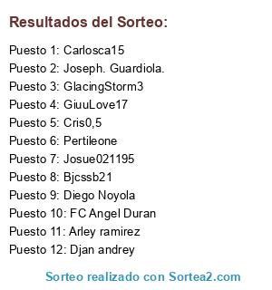Lista de participantes: Cris0,5, Arley ramirez, FC Angel Duran, Pertileone, GlacingStorm3, GiuuLove17, Josue021195, Carlosca15, Joseph. Guardiola., Bjcssb21, Djan andrey, Diego Noyola.