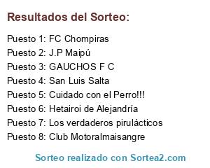 Lista de participantes: J.P Maipú, Los verdaderos pirulácticos, Club Motoralmaisangre, GAUCHOS F C, Hetairoi de Alejandría, San Luis Salta, Cuidado con el Perro!!!, FC Chompiras.