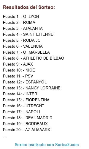 Lista de participantes: - AJAX, - AZ ALMAARK, - FEYENOORD, - GRONINGEN, - PSV, - TWENTE, - VITESSE, - RODA JC, - UTRECHT, - WILLEM II, - ATHLETIC DE BILBAO, - ATLETICO DE MADRID, - BARCELONA, - ESPANYOL, - GETAFE, - MALAGA, - REAL MADRID, - REAL SOCIEDAD, - SEVILLA, - VALENCIA, - BORDEAUX, - LILLE, - O. LYON, - O. MARSELLA, - MONTPELLIER, - NANCY LORRAINE, - NICE, - PSG, - SAINT ETIENNE, - TOULUSSE, - ATALANTA, - CHIEVO VERONA, - FIORENTINA, - GENOA, - INTER, - JUVENTUS, - LAZIO, - MILAN, - NAPOLI, - ROMA.