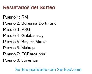 Lista de participantes: RM, Galatasaray, FCBarcelona, Bayern Munic, Borussia Dortmund, Malaga, Juventus, PSG.