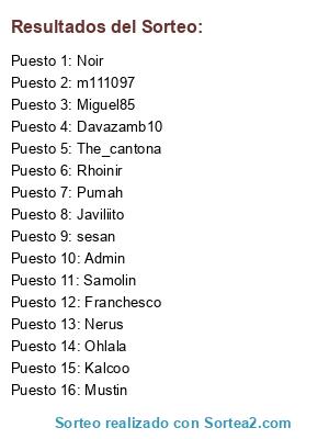 Lista de participantes: Franchesco, Ohlala, Mustin, Javiliito, Admin, The_cantona, Noir, Miguel85, m111097, sesan, Pumah, Kalcoo, Nerus, Davazamb10, Rhoinir, Samolin.
