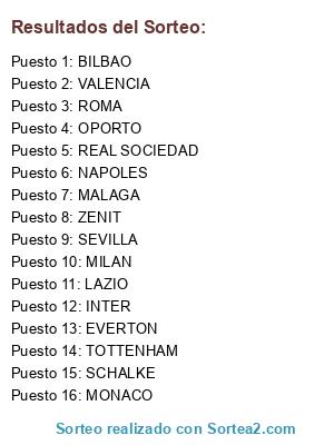 Lista de participantes: ZENIT, VALENCIA, REAL SOCIEDAD, OPORTO, MONACO, LAZIO, SCHALKE, MALAGA, SEVILLA, BILBAO, TOTTENHAM, ROMA, NAPOLES, MILAN, EVERTON, INTER.