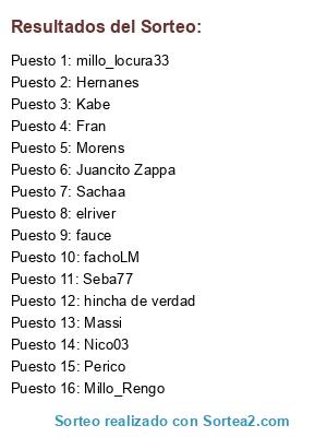 Lista de participantes: Perico, Millo_Rengo, Sachaa, Morens, Hernanes, hincha de verdad, Fran, Juancito Zappa, fauce, Seba77, Kabe, Nico03, Massi, fachoLM, millo_locura33, elriver.