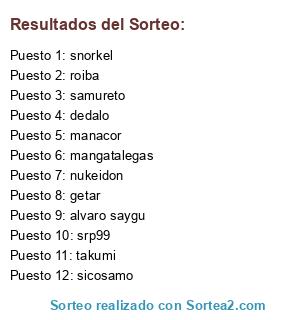 Lista de participantes: manacor, mangatalegas, srp99, takumi, dedalo, samureto, snorkel, sicosamo, roiba, nukeidon, getar, alvaro saygu.