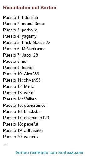 Lista de participantes: Icaros, New S@int, EderBati, Baco29, manu23mex, Izakv19, wizim, blackstar, arthas666, Mista, Alex986, MrVantrance, yagamy, Valken, luisxavi, shaka, pedro_x, hagenvampire, jaguar, Japg_28, Erick.Macias22, chivan93, Solidowen, davidramos, wondrix, chicharito123, rio, pepefut, chivarza, EL_KAKES.