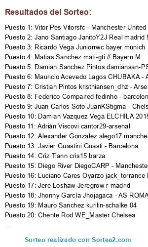 Lista de participantes: Juan Cruz Tabasso CABJjuan ---> MAN BLUE, Paul Asto Valdez Polasto - Barcelona, Russo Carlos Ariel russitooo - bayer munich, Juan Carlos Soto JuanKStigma - Chelsea, Damian Sanchez Pintos damiansan-PSG, Marcelo Seifert alvaradomdp real, Javier Barqui javibarqui - real madrid, Chente Rod WE_Master Chelsea, Lucas Leonardo Fernandez Lk20 real madrid, Belgratias Pes Belgratias - Chelsea, Luciano Cares Oyarzo jack_torrance PSG, Criz Tiann cris15 barza, Thiago Jansem TJANSEM - HAMPSHIRE RED, Alexander Gonzalez alego17 manchester United, Matias Sanchez mati-gti // Bayern M., Vitor Pes Vitorsfc - Manchester United, Mauro Sanchez kurilin-schalke 04, Uver Chavez Ogt - barcelona, Hackwey Gett Chuletamx bayern, Diego River DiegoCARP - Manchester United, Federico Compaired fedinho - barcelona, Jorge Meler JORGE-RIVER - M.CITY, Cristian Pintos kristhiansen_dhz - Arsenal (North London), Mauricio Acevedo Lagos CHUBAKA - ARSENAL, Fernando Camacho Marblephantasm - Juventus, Javier Guastini Guasti - Barcelona..., Sebastian Luque seba2015 - paris, Francisco Orellana Galvez francisco-cabj -real madrid, Ramiro Surbano Ramafull Bayer munich, Jano Santiago JanitoY2J Real madrid !, Gabril Mesinguer MICHINGA2014-real madrid, Sublimados Rosario Mou27 psg, Jere Loshaw Jeregrow r madrid, Arku Pes arku - Bayer Munich, Adrián Viscovi cantor29-arsenal, Luis Torres venezuelapower, Alejandro Farina Ramos ESTRATEGA - real madrid, Jorge Cartes jncartes-napoli, Juan Ignacio Bonaldo independiente de avellaneda, Da Ri Fegrva davigol- bayer munich, Damian Vazquez Vega ELCHILA 2015_ Manchester United, Nashoif Pes Nashoif9 - ARSENAL, Rodrigo Nicolas RodrigoZ74 -Chelsea, Ricardo Vega Juniorrwc bayer munich, Rodolfo Roggero Fitofarais - chelsea, Jhonny García Jhojagaca - AS ROMA, Germán Gao Chutix-barca, Dante Yucra yucra97 - Manchester United.