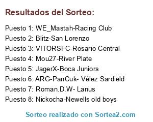 Lista de participantes: Mou27-River Plate, ARG-PanCuk- Vélez Sardield, VITORSFC-Rosario Central, Nickocha-Newells old boys, Blitz-San Lorenzo, WE_Mastah-Racing Club, Roman.D.W- Lanus, JagerX-Boca Juniors.