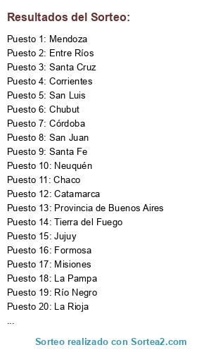 Lista de participantes: Santa Fe, Provincia de Buenos Aires, Tucumán, Mendoza, Misiones, San Luis, Entre Ríos, Salta, Neuquén, Chubut, Tierra del Fuego, La Pampa, Río Negro, Chaco, Córdoba, Santa Cruz, Ciudad de Buenos Aires, Jujuy, Formosa, San Juan, La Rioja, Corrientes, Catamarca, Santiago del Estero.