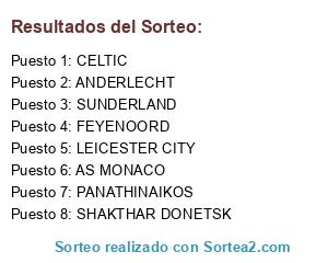 Lista de participantes: FEYENOORD, AS MONACO, LEICESTER CITY, CELTIC, SHAKTHAR DONETSK, SUNDERLAND, ANDERLECHT, PANATHINAIKOS.