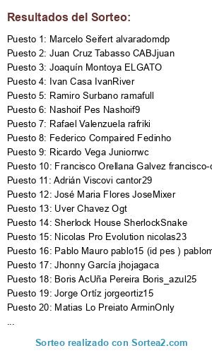 Lista de participantes: Miguel Angel Collantes llwlMACOlwll, Joaquin Garmendia Maurice joaquing84, Jorge Ortíz jorgeortiz15, Piku Restiver piku15, Belgratias Pes Belgratias, Damian Sanchez Pintos damiansan, Bruno Ceccotti ceccottibruno, Juan Cruz Tabasso CABJjuan, Juan Carlos Soto JuanKStigma, Guillermo Hernandez Guillotedel17, Uver Chavez Ogt, Alexander Gonzalez alego17, Hackwey Gett Chuletamx, Andres Vique andresmoron, Roman Pes Roman.D.W, José Maria Flores JoseMixer, Ivan Casa IvanRiver, Lucas Leonardo Fernandez Lk20, Matias Sanchez mati-gti, Tony Pardo Ayola TONY.P, Sublimados Rosario Mou27, Nashoif Pes Nashoif9, Marcelo Moreira Mancebo Chelobest, Adrián Viscovi cantor29, Diego Ignacio Salvador me sumo! Príncipe Penta, Ricardo Vega Juniorrwc, Sherlock House SherlockSnake, Boris AcUña Pereira Boris_azul25, Tony Paredes Lusich tony2015, Federico Compaired Fedinho, Raul Zuñiga Misifuss, Emaiden Pes enrimaiden, Gaston Gaiada gasgaia, Rafael Valenzuela rafriki, Javier Barqui javibarqui, José A. Mendieta T jamendieta, Mauricio Acevedo Lagos chubaka, Criz Tiann cris15, Javier Guastini Guasti, Jorge Meler JORGE-RIVER, Elchila Vazquez Vega CHILA2015, Juan Ignacio Politi elburbuuh, Moreno Stick Lord_sticker, Rodolfo Roggero Fitofarais, Arku Pes arku, Ramiro Surbano ramafull, Manuel Nicolás Degam Nickocha, Jhonny García jhojagaca, Luis Torres Venezuelapower, Ruben Dario Mora Zambrano rdmz, Marcelo Seifert alvaradomdp, Lautaro León twenty one, Francisco Orellana Galvez francisco-cabj, Benjamin Firmani benob2015, Pablo Mauro pablo15 (id pes ) pablomauro (id steam), Nehuen Emiliano Hurt emi, Vitor Santos Canuto vitorsfc, Cali Cagnone CaliCagnone, Diego River DiegoCARP, Alejandro Farina Ramos ESTRATEGA, Nicolas Pro Evolution nicolas23, Jaicolle Pes Jaicolle, Matias Lo Preiato ArminOnly, Joaquín Montoya ELGATO.