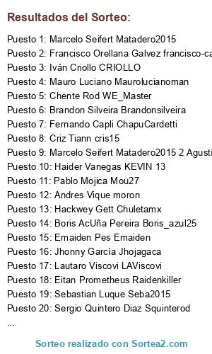 Lista de participantes: Brandon Silveira Brandonsilveira, Mauro Luciano Maurolucianoman, Iván Criollo CRIOLLO, Boris AcUña Pereira Boris_azul25, Marcelo Seifert Matadero2015, Emaiden Pes Emaiden, Marcelo Seifert Matadero2015 2 Agustín seifert, Manuel Fernando David Kimimarofd, Taladro Cero Nueve taladro09, Andres Vique moron, Uver Chavez ogt, Russo Carlos Ariel russitooo, Hackwey Gett Chuletamx, Chente Rod WE_Master, Eitan Prometheus Raidenkiller, Fernando Capli ChapuCardetti, Federico Andres Manzano Ramirez Famr1989, Dayner Rizo Segura dayn3er, Lucas Leonardo Fernandez Lk20, Sergio Quintero Diaz Squinterod, Cristian Garzon krilin18, Jhonny García Jhojagaca, Rodolfo Roggero Fitofarais, Sebastian Luque Seba2015, Rodri Zamora Rodrii271, Pablo Mojica Mou27, Sergi Vidal Cardona elprimodepego, Anibal Roteta TIEFO, Criz Tiann cris15, Daniel Viscovi danipro, Juan Cruz Tabasso CABJjuan, Francisco Orellana Galvez francisco-cabj, Javier Guastini Guasti, Matías Pereyra Perufaso, Lautaro Viscovi LAViscovi, Matias Sanchez mati-gti, Rodrigo Juarez rodrigo2024, Haider Vanegas KEVIN 13.