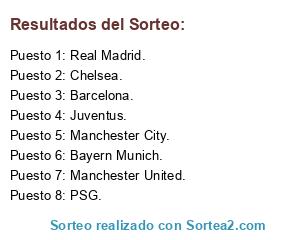 Lista de participantes: Barcelona., Real Madrid., Juventus., Chelsea., Manchester United., Manchester City., Bayern Munich., PSG..