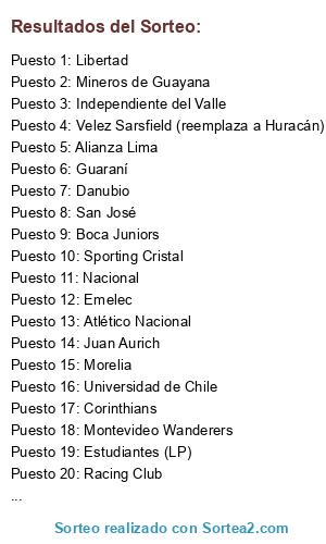Lista de participantes: San Lorenzo, River Plate, Racing Club, Boca Juniors, Velez Sarsfield (reemplaza a Huracán), Estudiantes (LP), Universitario de Sucre, San José, The Strongest, Cruzeiro, Atlético Mineiro, São Paulo, Internacional, Corinthians, Colo-Colo, Universidad de Chile, Universidad Catolica (reemplaza a Palestino), Atlético Nacional, Santa Fe, Deportivo Cali (reemplaza a Once Caldas), Emelec, Barcelona, Independiente del Valle, Santos Laguna (reemplaza a Tigres), León (reemplaza a Atlas), Morelia, Libertad, Guaraní, Cerro Porteño, Sporting Cristal, Juan Aurich, Alianza Lima, Danubio, Montevideo Wanderers, Nacional, Mineros de Guayana, Zamora, Caracas F.C. (reemplaza a Deportivo Táchira).