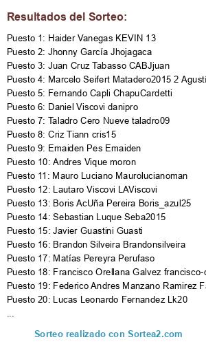 Lista de participantes: Brandon Silveira Brandonsilveira, Mauro Luciano Maurolucianoman, Iván Criollo CRIOLLO, Boris AcUña Pereira Boris_azul25, Marcelo Seifert Matadero2015, Emaiden Pes Emaiden, Marcelo Seifert Matadero2015 2 Agustín seifert, Manuel Fernando David Kimimarofd, Taladro Cero Nueve taladro09, Andres Vique moron, Uver Chavez ogt, Russo Carlos Ariel russitooo, Hackwey Gett Chuletamx, Chente Rod WE_Master, Eitan Prometheus Raidenkiller, Fernando Capli ChapuCardetti, Federico Andres Manzano Ramirez Famr1989, Dayner Rizo Segura dayn3er, Lucas Leonardo Fernandez Lk20, Sergio Quintero Diaz Squinterod, Cristian Garzon krilin18, Jhonny García Jhojagaca, Rodolfo Roggero Fitofarais, Sebastian Luque Seba2015, Rodri Zamora Rodrii271, Pablo Mojica Mou27, Sergi Vidal Cardona elprimodepego, Anibal Roteta TIEFO, Criz Tiann cris15, Daniel Viscovi danipro, Juan Cruz Tabasso CABJjuan, Francisco Orellana Galvez francisco-cabj, Javier Guastini Guasti, Matías Pereyra Perufaso, Lautaro Viscovi LAViscovi, Matias Sanchez mati-gti, Rodrigo Juarez rodrigo2024, Haider Vanegas KEVIN 13.