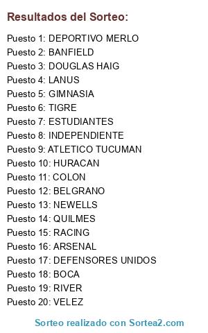 Lista de participantes: ARSENAL, BANFIELD, BELGRANO, BOCA, ESTUDIANTES, GIMNASIA, ATLETICO TUCUMAN, HURACAN, INDEPENDIENTE, DEPORTIVO MERLO, DEFENSORES UNIDOS, LANUS, NEWELLS, QUILMES, RACING, COLON, RIVER, DOUGLAS HAIG, TIGRE, VELEZ.