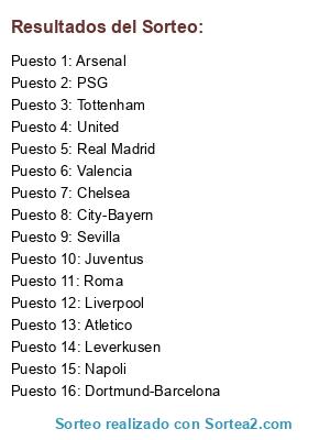 Lista de participantes: Tottenham, Leverkusen, Liverpool, Sevilla, Atletico, Arsenal, PSG, Valencia, United, Juventus, Real Madrid, Chelsea, Roma, Napoli, Dortmund-Barcelona, City-Bayern.