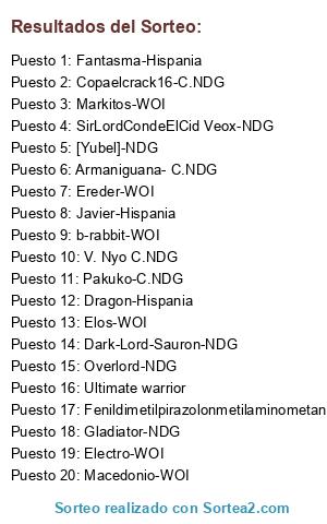 Lista de participantes: SirLordCondeElCid Veox-NDG, Fenildimetilpirazolonmetilaminometanfulfonato sódico-NDG, Dark-Lord-Sauron-NDG, Armaniguana- C.NDG, [Yubel]-NDG, Fantasma-Hispania, Ereder-WOI, Dragon-Hispania, Electro-WOI, Macedonio-WOI, b-rabbit-WOI, Copaelcrack16-C.NDG, Markitos-WOI, Elos-WOI, Gladiator-NDG, Pakuko-C.NDG, Overlord-NDG, Ultimate warrior, Javier-Hispania, V. Nyo C.NDG.