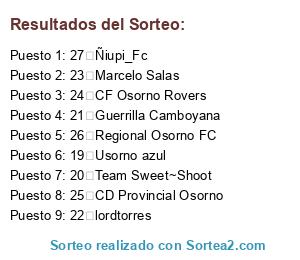 Lista de participantes: 19 Usorno azul, 20 Team Sweet~Shoot, 21 Guerrilla Camboyana, 22 lordtorres, 23 Marcelo Salas, 24 CF Osorno Rovers, 25 CD Provincial Osorno, 26 Regional Osorno FC, 27 Ñiupi_Fc.