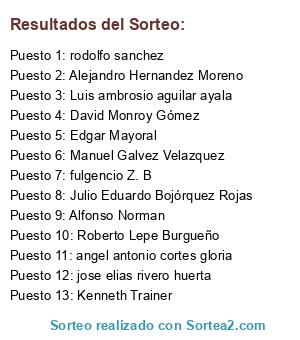Lista de participantes: Julio Eduardo Bojórquez Rojas(5 participaciones), Manuel Galvez Velazquez (7 participaciones), Alejandro Hernandez Moreno, angel antonio cortes gloria, Kenneth Trainer, Luis ambrosio aguilar ayala(4 participaciones), fulgencio Z. B(4 participaciones), David Monroy Gómez(4 participaciones), Fernando Ilizaliturri Vargas(4 participaciones), Alfonso Norman(4 participaciones), Roberto Lepe Burgueño(4 participaciones), Edgar Mayoral, jose elias rivero huerta.