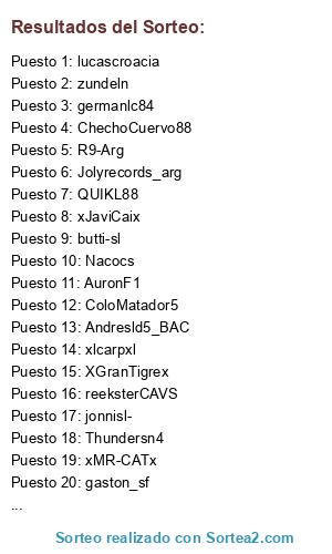 Lista de participantes: XGranTigrex, Nacocs, ColoMatador5, Andresld5_BAC, xJaviCaix, R9-Arg, ChechoCuervo88, gaston_sf, Kingsotosca, marcelod1978, go_FLIP, reeksterCAVS, lucascroacia, xWicked85, Emakd, Thundersn4, zundeln, jonnisl-, germanlc84, butti-sl, QUIKL88, xlcarpxl, Jolyrecords_arg, botu_AKD, AuronF1, xMR-CATx.