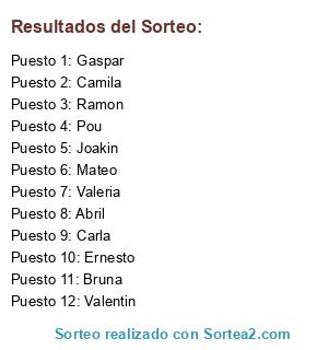 Lista de participantes: Camila, Valentin, Carla, Pou, Ernesto, Mateo, Ramon, Bruna, Gaspar, Valeria, Joakin, Abril.
