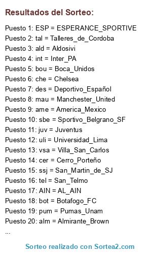 Lista de participantes: all = All_Boys, alm = Almirante_Brown, atl = Atletico_Tucuman, ald = Aldosivi, bou = Boca_Unidos, cen = Rosario_Central, inr = Independiente_Rivadavia, itu = Ituzaingo, mer = Deportivo_Merlo, new = Newells, god = Godoy_Cruz, hur = Huracan, dha = Douglas_Haig, vsa = Villa_San_Carlos, tem = Temperley, qui = Quilmes, sar = Sarmiento_de_Junin, cha = Chacarita, fer = Ferro, riv = River, lan = Lanus, bel = Belgrano, col = Colon, ars = Arsenal, arg = Argentinos_jrs, gyj = Gimnasia_de_Jujuy, tig = Tigre, ind = Independiente, int = Instituto, pat = Patronato, san = San_Lorenzo, uni = Union_de_Santa_Fe, vel = Velez, AHL = AL_AHLY, AIN = AL_AIN, ULS = ULSAN_HYUNDAI, SHA = SHANGAI_SHENHUA, FRE = SAN_FRECCE, ESP = ESPERANCE_SPORTIVE, CAS = WYDAD_CASABLANCA, BRI = BRISBANE_ROAR, ben = Benfica_FC, nap = Napoli, oll = Olympique_Lyonnais, pan = Panathinaikos, psg = París_Saint_Germain, por = Porto_FC, wbr = Werder_Bremen, arl = Arsenal_Inglaterra, bor = Borussia_Dortmund, che = Chelsea, csk = CSKA_Moscow, imi = Inter_Milan, juv = Juventus, liv = Liverpool, mau = Manchester_United, val = Valencia, gal = Galatasaray, atm = Atletico_Madrid, aja = Ajax, alv = Alvarado, oli = Olimpo, smt = San_Martin_de_Tucuman, cai = C.A.I., tal = Talleres_de_Cordoba, sbe = Sportivo_Belgrano_SF, eba = Estudiantes_de_BsAs, tel = San_Telmo, att = Atlanta, bro = Brown_de_Adrogue, ssj = San_Martin_de_SJ, dks = Sp_Dock_Sud, sre = Sarmiento_de_Resistencia, des = Deportivo_Español, pla = Platense, man = Mandiyu_de_Corrientes, nor = Crucero_del_Norte, atr = Atletico_Rafaela, chi = Nueva_Chicago, amc = America_Cali, ami = Atletico_Mineiro, bot = Botafogo_FC, cru = Cruzeiro, dqu = Deportivo_Quito, dto = Deportes_Tolima, flu = Fluminense, gre = Gremio, int = Inter_PA, nmo = Nacional_Montevideo, olp = Olimpia_Paraguay, pal = Palmeiras, pum = Pumas_Unam, sao = Sao_Paulo, ame = America_Mexico, anm = Atletico_Nacional_Medellin, bar = Barcelona_Ecuador, bol = Bolivar_LP, cer = Cerro_Porteño, caz = Cruz_Azul, cor = Corinthians, dan = Danubio, dth = Deportivo_Tachira, jau = Juan_Aurich, lag = Los_Angeles_Galaxy, lib = Libertad_Paraguay, ldq = Liga_Quito, mon = Monterrey, nyr = New_York_Red_Bulls, scr = Sporting_Cristal, uca = Universidad_Catolica, uch = Universidad_Chile, uli = Universidad_Lima.