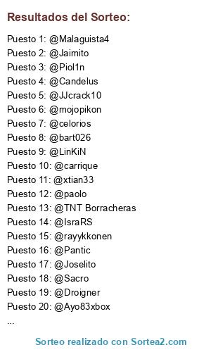 Lista de participantes: @paolo, @TNT Borracheras, @Pantic, @mojopikon, @Sacro, @bart026, @Piol1n, @celorios, @JJcrack10, @Ayo83xbox, @rayykkonen, @Jusedilo, @carrique, @LinKiN, @gabito09, @Jordycf, @xtian33, @erpollo, @Jaimito, @Joselito, @Candelus, @Malaguista4, @IsraRS, @Noan, @Droigner.