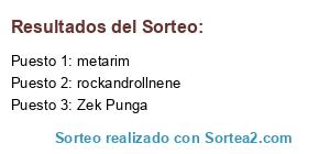 Lista de participantes: Charly Ballange, Franco.Chaca, juegos720, caudio, Miguelmh, bruno argento, gonzalo.32, JOy13, julioeze123, ElAiel, Zek Punga, elgordo93, Jezabel Ark, Axelopolis, Juanle, diegoopitu, el_che_reload, gustito22, baresyfondas, COLORR, fedexpozzi, Xochitonal, rockandrollnene, leandrojas, megacarnage, eltavo1969, gas2293, Solamente yo, richie666, metarim.
