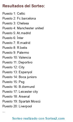 Lista de participantes: R.madrid, Fc.barcelona, Liverpool, R.betis, Arsenal, At.madrid, Manchester united, Espanyol, Spartak Moscú, Psg, Leicester city, Bayer munich, Boca juniors, Celtic, Valencia, City, Chelsea, B.dormund, Palermo, Ínter, Deportivo.