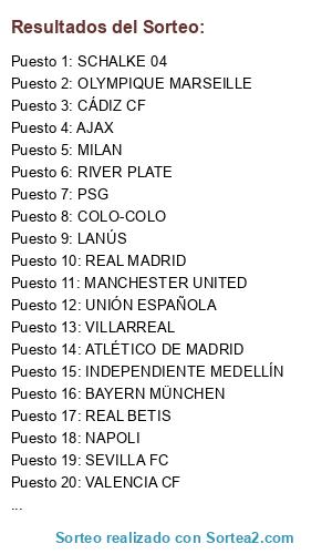 Lista de participantes: AEK ATHENS, AJAX, ARSENAL, ATLÉTICO DE MADRID, BAYERN MÜNCHEN, BOCA JUNIORS, CÁDIZ CF, COLO-COLO, FEYENOORD, INDEPENDIENTE MEDELLÍN, JUVENTUS, LANÚS, MANCHESTER UNITED, MILAN, NAPOLI, OLYMPIQUE MARSEILLE, PSG, REAL BETIS, REAL MADRID, RIVER PLATE, ROMA, SCHALKE 04, SEVILLA FC, UNIÓN ESPAÑOLA, VALENCIA CF, VILLARREAL.