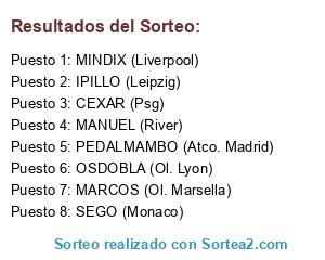 Lista de participantes: PEDALMAMBO (Atco. Madrid), CEXAR (Psg), OSDOBLA (Ol. Lyon), MARCOS (Ol. Marsella), IPILLO (Leipzig), MINDIX (Liverpool), MANUEL (River), SEGO (Monaco).