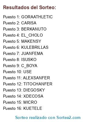 Lista de participantes: MICRO, KUETELE, C_BOYA, ISUSKO, GORAATHLETIC, EL_CHOLO, ALEXSANFER, USE, DIEGOSKY, MAKENSY, CARISA, BERKANUTO, XDECOSA, JUANFEMA, TITOCHANFER, KULEBRILLAS.