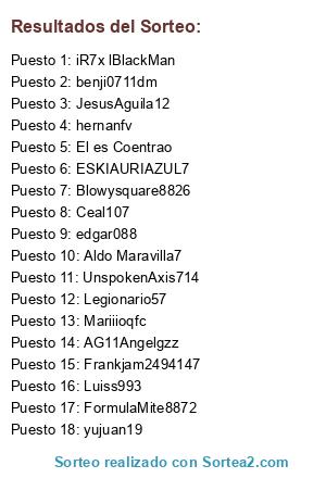 Lista de participantes: iR7x lBlackMan, Aldo Maravilla7, hernanfv, yujuan19, Ceal107, Mariiioqfc, edgar088, ESKIAURIAZUL7, Legionario57, Frankjam2494147, benji0711dm, UnspokenAxis714, AG11Angelgzz, Blowysquare8826, FormulaMite8872, El es Coentrao, JesusAguila12, Luiss993.
