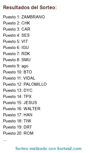 Lista de participantes: DYC, TPX, VIT, RDK, S26, SMU, TIW, JAV, JUANJO, BTO, CUR, SES, IGU, JESUS, ZAMBRANO, PALOMILLO, CHK, VIDAL, WALTER, CAR, DRT, ago, ROM, HAN.