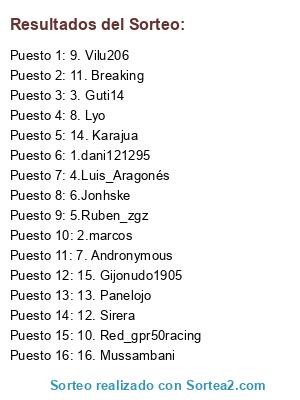 Lista de participantes: 1.dani121295, 2.marcos, 3. Guti14, 4.Luis_Aragonés, 5.Ruben_zgz, 6.Jonhske, 7. Andronymous, 8. Lyo, 9. Vilu206, 10. Red_gpr50racing, 11. Breaking, 12. Sirera, 13. Panelojo, 14. Karajua, 15. Gijonudo1905, 16. Mussambani.