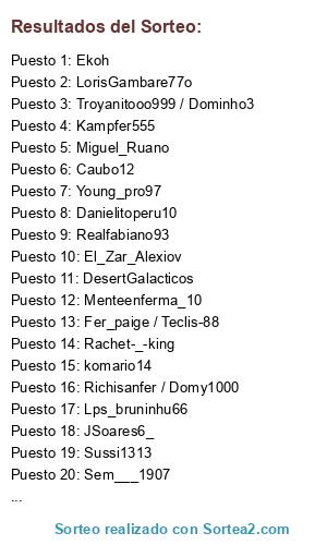 Lista de participantes: Caubo12, Erkobra18, Sem___1907, Mallorca_killer9, LorisGambare77o, Menteenferma_10, Fer_paige / Teclis-88, Young_pro97, Lps_bruninhu66, RoblessGG1, Genoa_NPK02, Troyanitooo999 / Dominho3, El_Zar_Alexiov, Malasombra21, Realfabiano93, Sam---, JSoares6_, Stejinn7, komario14, ALE87_ITA, Richisanfer / Domy1000, Danielitoperu10, PixMax_GRD, Rachet-_-king, DesertGalacticos, Ekoh, Abrahamm0726, gutista-14-, Kampfer555, Miguel_Ruano, Superdinho, Sussi1313.