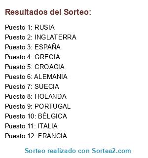 Lista de participantes: ESPAÑA, HOLANDA, ALEMANIA, FRANCIA, INGLATERRA, ITALIA, PORTUGAL, SUECIA, RUSIA, GRECIA, CROACIA, BÉLGICA.