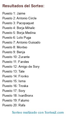 Lista de participantes: Faroles, Antonio Guisado, Antonio Circle, IvanBronx, Lolo Puga, Sory, Borja Medina, Borja Mihalic, Montxo, Jaime, Tate, Rafa, Troska, Fronko, Pacopaquet, Isma, Falumo, Benja, Zurante, Amigo de Sory.