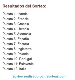 Lista de participantes: Alemania, España, Croacia, Portugal, Italia, Francia, Inglaterra, Polonia, Ucrania, Irlanda, Escocia, Eslovenia.
