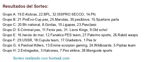 Lista de participantes: 1.Pes br, 2.Entregados, 3.Halcones, 4.Pestival Killers, 5.Pipitas team, 6.Criminal pes, 7.Pes skiline, 8.Gorilas, 9.Old schol, 10.Ligapes, 11.Fenix pes, 12.Fanatics PES team, 13.Emme scorpion gaming, 14.Pfc, 15.Spartans parla, 16.herois do mar, 17.Gladiators, 18.Cupula team, 19.E-Kobras, 20.Bh national, 21.ProEvo-Cup pes, 22.BPL, 23.Pesclasic, 24.Wildboards, 25.Manolas, 26.Rabid wasps, 27.Palermo sports, 28.Manguste sports, 29.USSR, 30.pes&love, 31. Lions Kings, 32.ISSPRO SECCO.