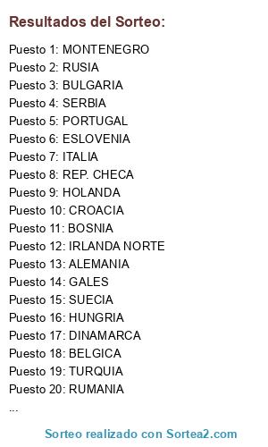 Lista de participantes: ESPAÑA, ITALIA, ALEMANIA, INGLATERRA, HOLANDA, FRANCIA, PORTUGAL, SERBIA, SUECIA, RUSIA, BELGICA, CROACIA, SUIZA, TURQUIA, REP. CHECA, BOSNIA, DINAMARCA, POLONIA, ESLOVAQUIA, GALES, RUMANIA, UCRANIA, IRLANDA, ESCOCIA, NORUEGA, GRECIA, MONTENEGRO, ISRAEL, BULGARIA, HUNGRIA, IRLANDA NORTE, ESLOVENIA.