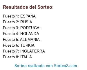 Lista de participantes: ALEMANIA, TURKIA, ITALIA, INGLATERRA, ESPAÑA, PORTUGAL, HOLANDA, RUSIA.