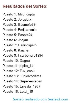 Lista de participantes: Super-esteban, Mvd_cripta, Emijuansolo, Jorgebrx, Pasota24, Juniorcodema, Erreala_1987, Kaizher, Letal_19, Carlillospalo, Dageal, Iliasmofe69, Fcarbonero1994, Jhojan, Tux_cook, pipita_14.