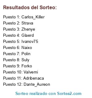 Lista de participantes: Adribenaca, Dante_Aureon, Naixo, Carlos_Killer, Strava, Ivanov75, Suly, Glaerd, Zhenye, Forko, Valvemi, Polin.