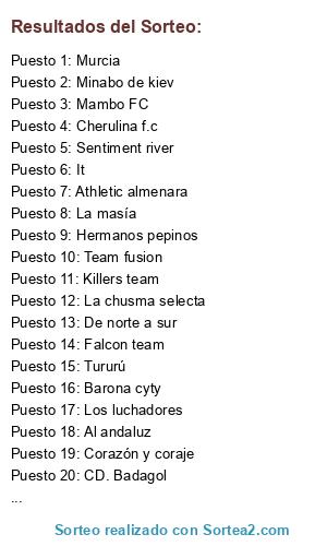 Lista de participantes: La canarinha, Si no perdemos empatamos, Barona cyty, Mambo FC, Murcia, Hermanos pepinos, El método, CD. Badagol, Cuenca eagles FC, Corazón y coraje, Los salas, It, Minabo de kiev, La masía, Coronavirus, Team fusion, Athletic almenara, Las viejas glorias, Mortoslotros, Los chabeas, Los follinos, Killers team, Falcon team, Amunteam, Al andaluz, Los luchadores, La chusma selecta, Tururú, De norte a sur, Sons of calleti f.c, Sentiment river, Cherulina f.c.