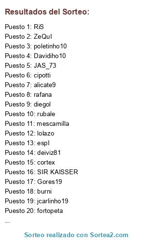Lista de participantes: mescamilla, cipotti, richisanfer, Perdy_trs, Hybrid, eL_PeLuSa_, Davidiho10, sefirottt, espI, Isra, Pedrito_hospi, rubale, _Gatsu_, Sk0rpio, cortex, artero, angelcop83, Wilgis Sosa, ScOrP1oN, burni, danicanario, rafana, ruben-94_, JosePolo, JAS_73, Gandulaco, roqueluis, jcarlinho19, sete, flakojmays, Winning__11, Juandy, RiS, fortopeta, iru, SIR KAISSER, IKER-00, makiki, manussv14, CaTa-_8, ravenn8, ZeQuI, DomiN, Gores19, hintoni, shanero, vicente_el_mas, assalito, fuentesiko, Sugerman, deiviz81, poletinho10, moisinho, israelgalan, diegol, Agu_CWM, lolazo, litoo, francis15, maykelillo9, titi_axel_14, The Joker, pacoytete, alicate9.